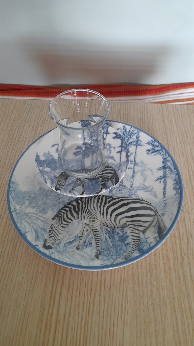 mavi zemin üzerinde zebra ve doğa desenli çay tabağı ve kahvaltı & pasta tabağı.
