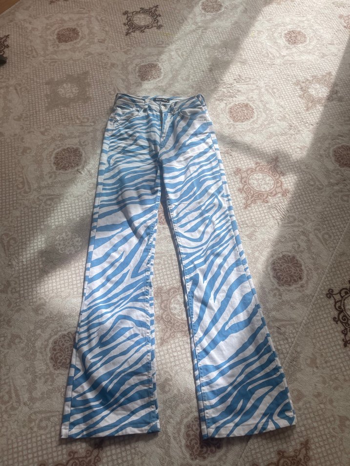 Mavi zebra desenli, salaş kesim midi boy kot pantolon, plise detaylı, rahat ve şık dış mekan kullanımı için uygun.