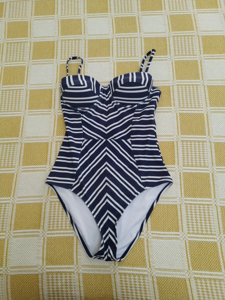 Mavi zebra desenli, strappy askılı, pile detaylı ve vücuda oturan mayo. Midi boyda, çağdaş athleisure tarzında plaj için uygun.ustte renk solması mevcut resimde var.