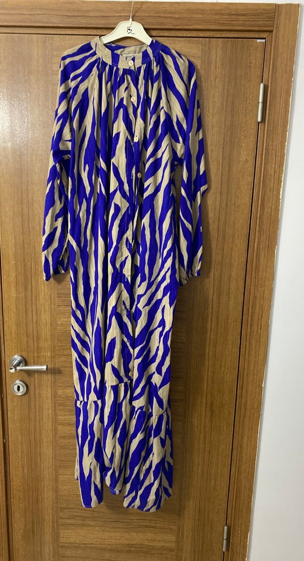 Mavi zebra desenli, uzun ve pilili kadın elbisesi. Uzun kollu ve kayık yaka, bohem tarzda. Günlük kullanıma uygun şık bir seçim.