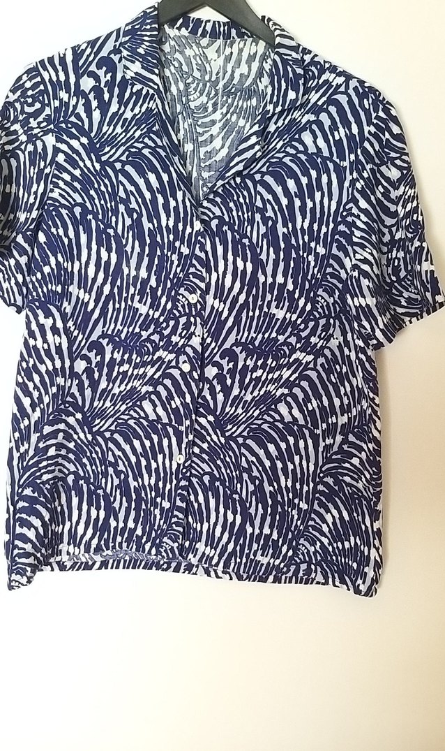 Kısa kollu, V yakalı, mavi zebra desenli, normal kesim kadın gömleği. Günlük sokak stiline uygun.