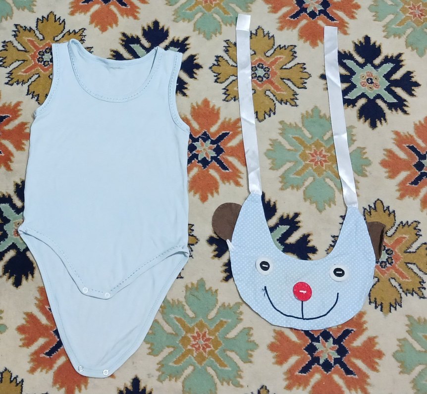 Kolsuz, mavi renkli erkek bebek zıbın, yuvarlak yaka. Pamuk kumaştan, renkli baskılı ve temiz. Bir de mama önlüğü. Tertemiz, yeni gibi. 6-9 ay.