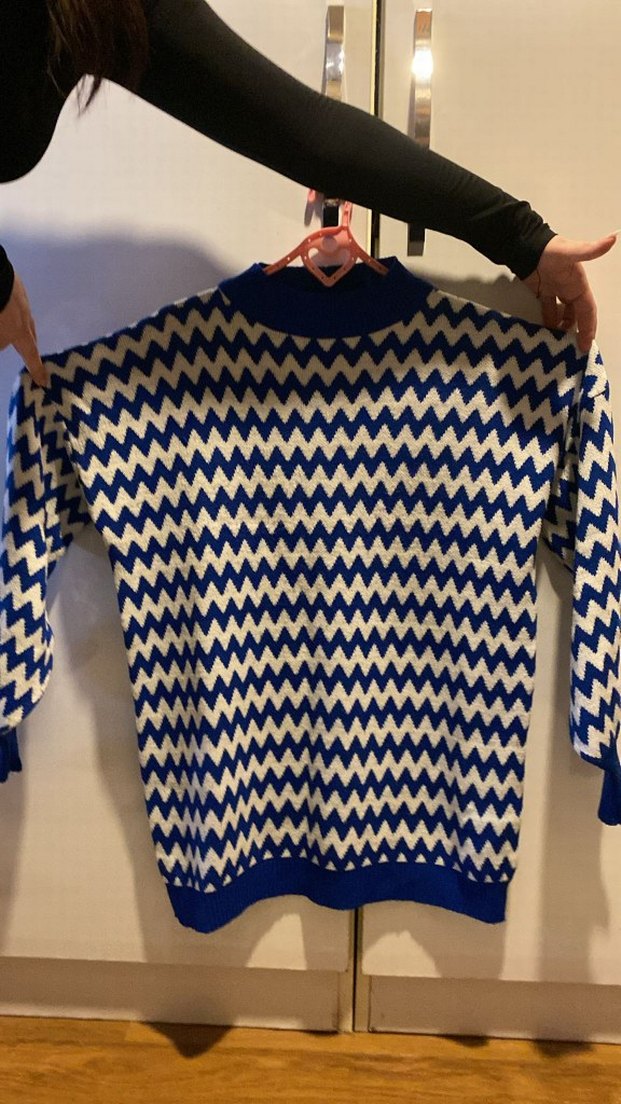 Bu dar kesim kadın kazağı, yüksek yakalı ve uzun kolludur. Parlak mavi zigzag desenli triko kumaştan üretilmiştir. Günlük kullanıma uygun, rahat ve şık bir sokak stili sunar.