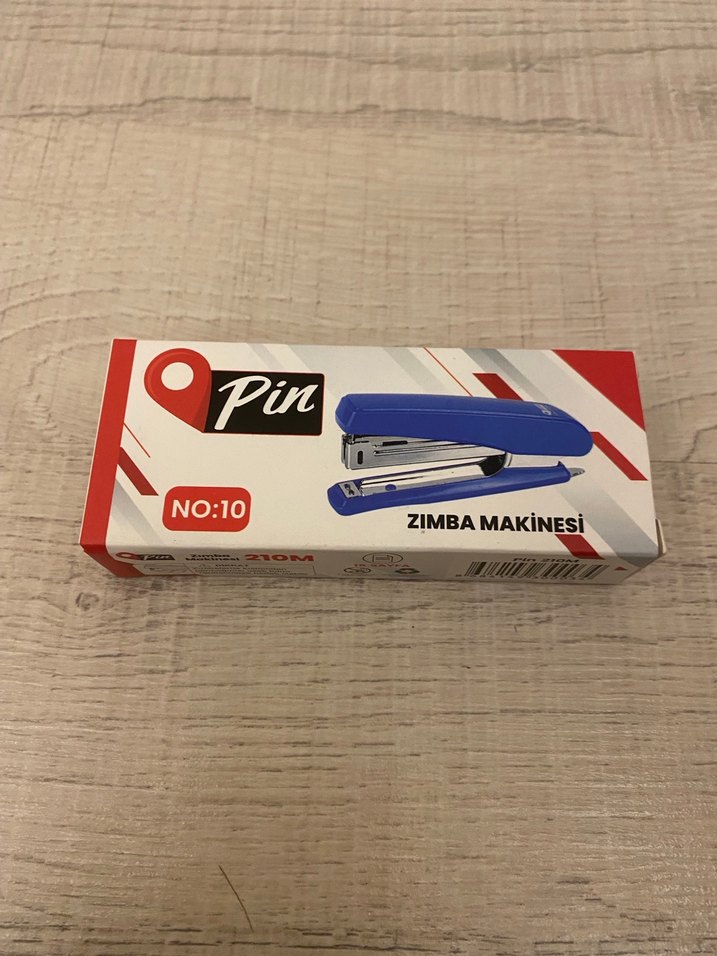 Renkli tasarımlı mavi zımba makinesi, model numarası 10, Pin markalı. Ofis kullanımı için kompakt ve pratik.