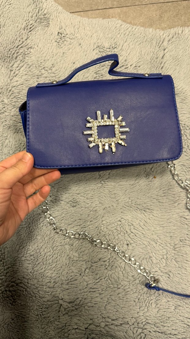 Parlak mavi deri kadın çanta, zincir detaylı ve nakışlı desene sahip. Paris ve retro sokak stilini yansıtıyor. Günlük kullanıma uygun.