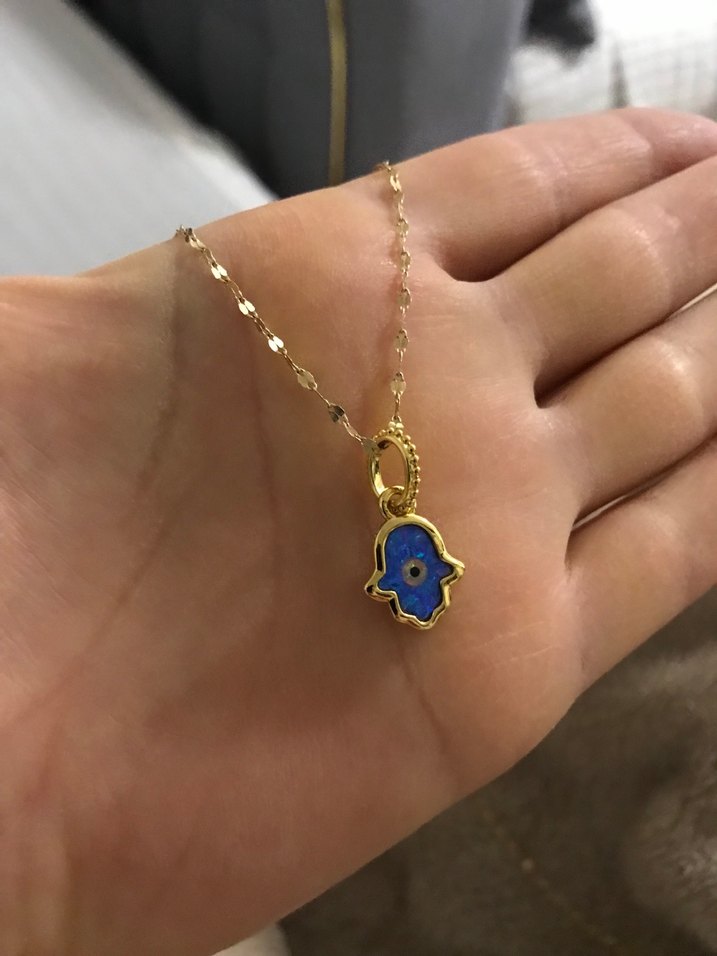 Zarif zincir ve parlak mavi Hamsa kolye ucu, minimalist ve bohem tarzda, günlük kullanım için uygundur. ✨