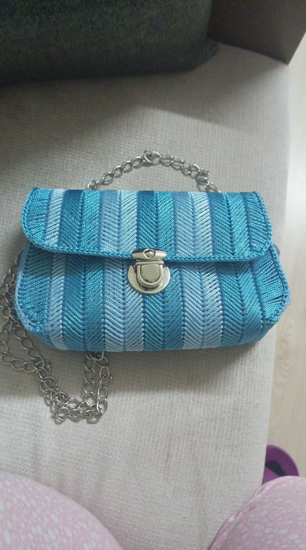 Mavi sentetik kumaştan, zincir detaylı, bağlama desenli bohem tarzda kanvas örgü kadın çantası, günlük kullanıma uygun.