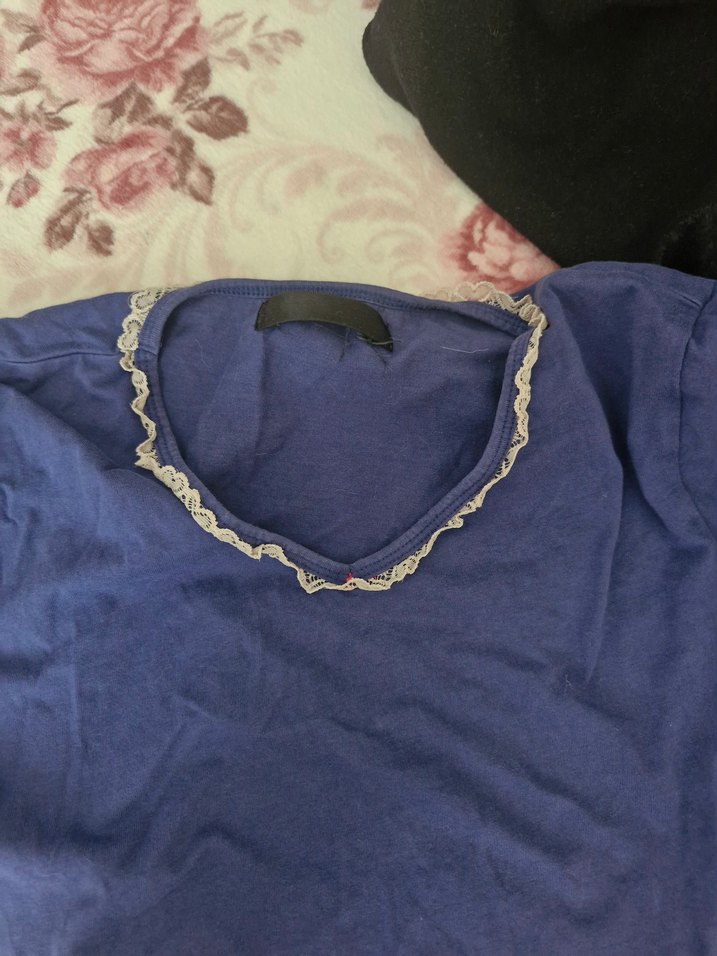 Zincir detaylı yuvarlak yaka, kısa kollu, mavi parlak renkli Yumuşak keten kumaştan ve normal boyda, günlük kullanıma uygun.
