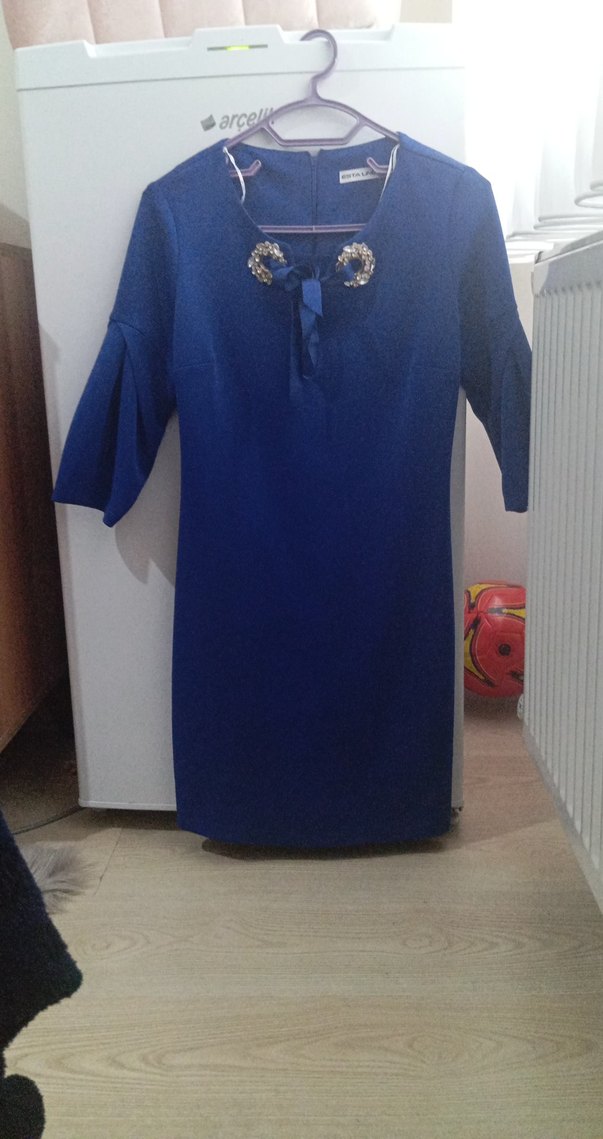 Mavi renkte, kısa kollu ve bisiklet yaka, zincir detaylı, baskılı midi elbise. Ofis için uygun, şık ve rahat bir kesime sahiptir.