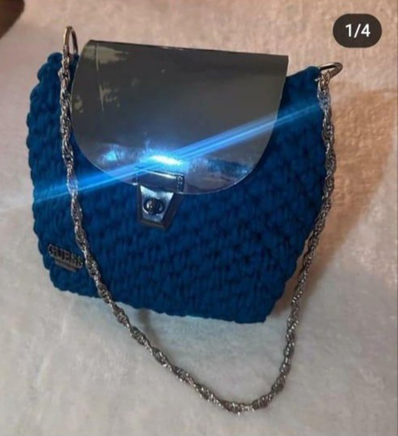 Parlak mavi renkli, zincir detaylı örgü kadın çantası. Kapaklı tasarımı ve rahat dokusuyla günlük kullanıma uygun, desensiz model.ürün sıfırdır hem günlük hemde bir davette kullanılabilir