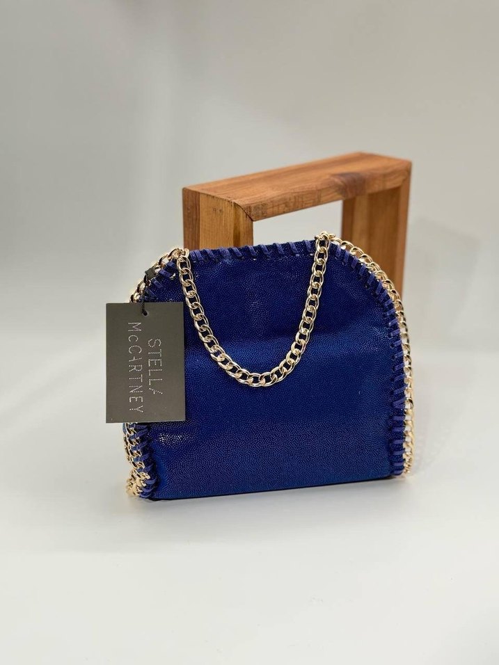 Mavi süet kumaştan yapılmış, zincir detaylı kadın çantası. Parlak yüzey ve baskılı desene sahip, romantik akşamlar için uygun.