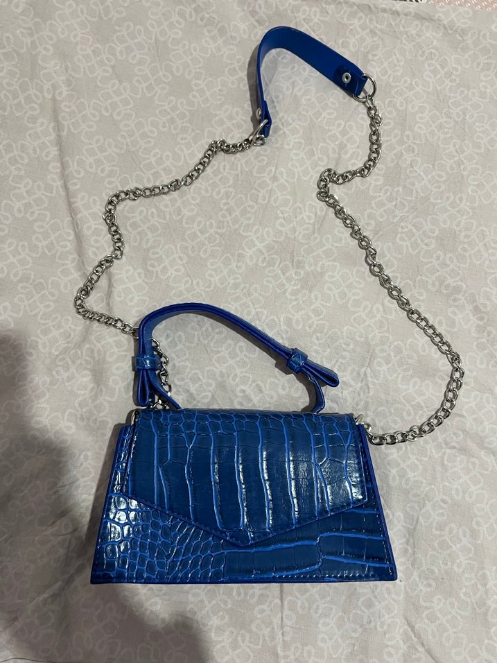 Parlak mavi deri çanta, yılan derisi desenli ve zincir detaylıdır, trend sokak stili için uygundur.