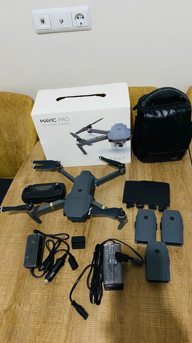 Koyu gri Mavic Pro drone, iki ekstra batarya, uzaktan kumanda, şarj cihazı ve taşıma çantası ile birlikte gelir. Çok yönlü hava fotoğrafçılığı için uygundur.