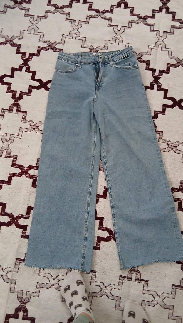 Denim kumaştan geniş kesim, midi boy kadın kot pantolon. Günlük kullanıma uygun, rahat ve şık bir sokak stili.