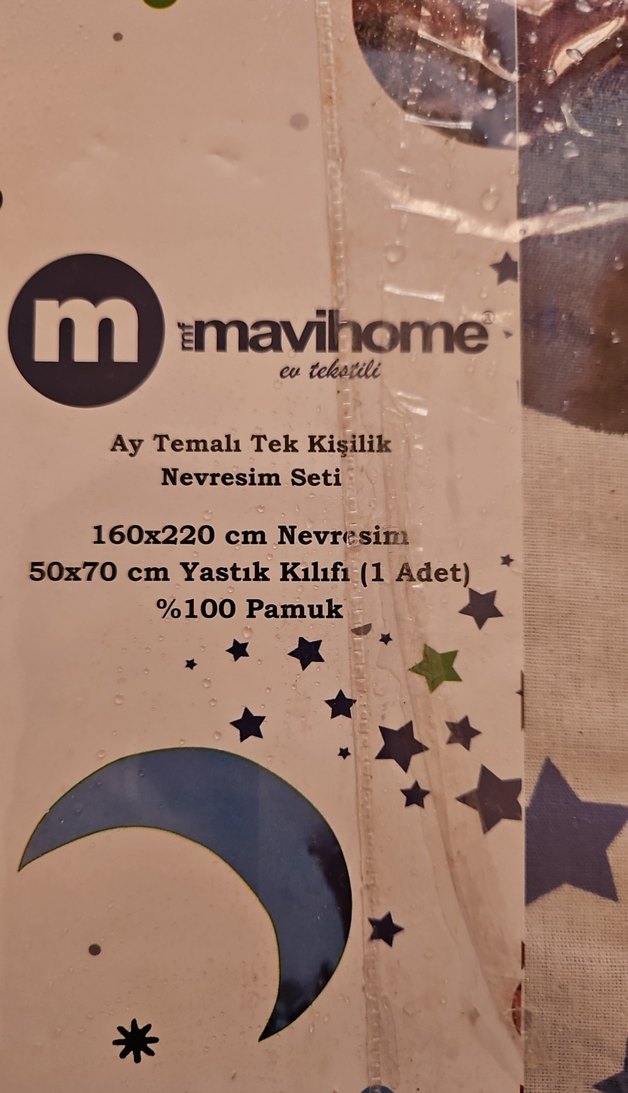 Mavihome ay temalı tek kişilik nevresim seti, %100 pamuk. 160x220 cm nevresim ve 50x70 cm yastık kılıfı içerir.