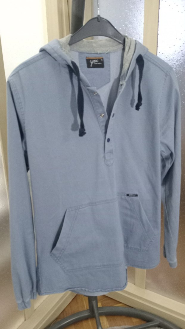Bu erkek denim sweat, uzun kollu, yakalı ve düğmeli ön detayına sahiptir. normal uzunlukta, kapüşonlu ve ip detaylıdır. mavi renk ve sokak stili günlük kullanım için uygundur.
