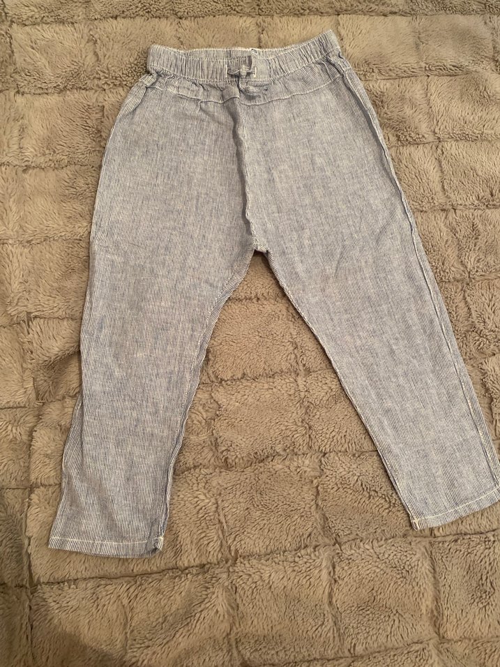Mavi renkte, yumuşak keten kumaştan yapılmış erkek çocuk bol kesim pantolon, düğmeli ön detaylıdır.
