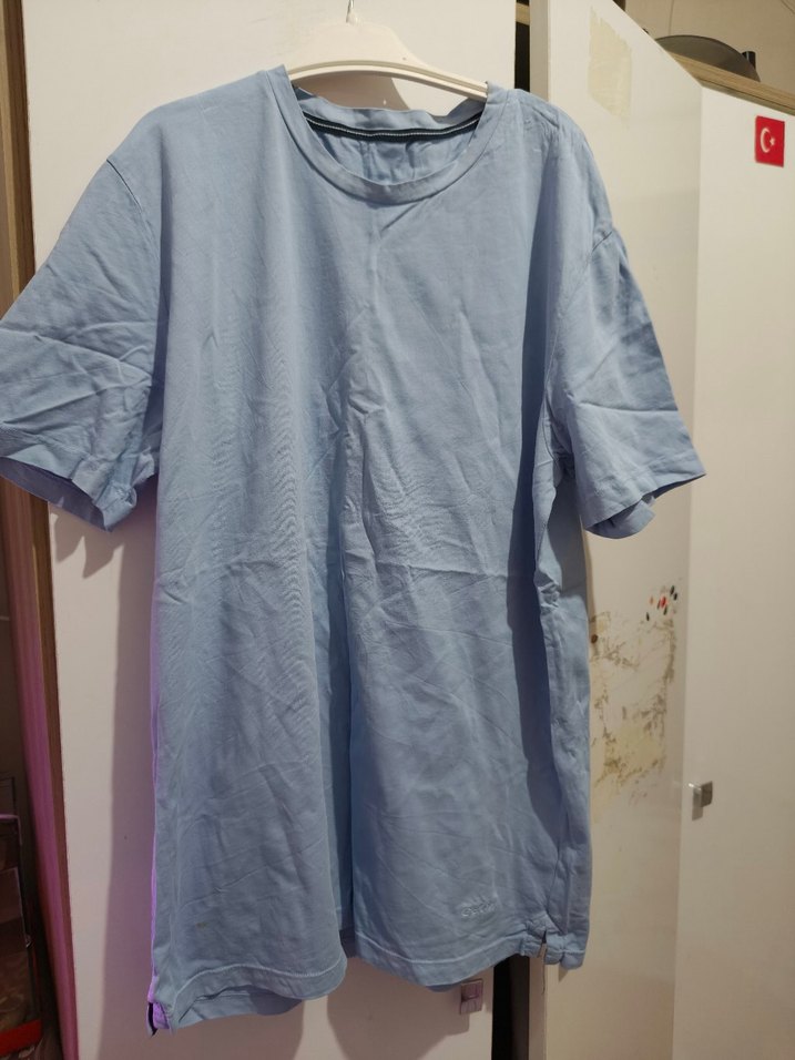 Mavi , kısa kollu, erkek tişört. Desensiz ve rahat sokak stili için uygun.