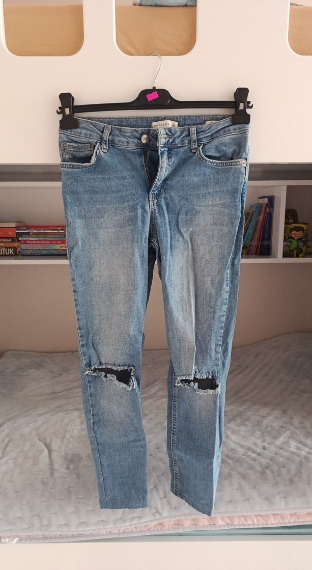 mavi renkli, bol kesim, sokak stili detaylı kot pantolon. Dizlerde yırtık ve tokalı özellikler bulunur, günlük kullanıma uygundur.