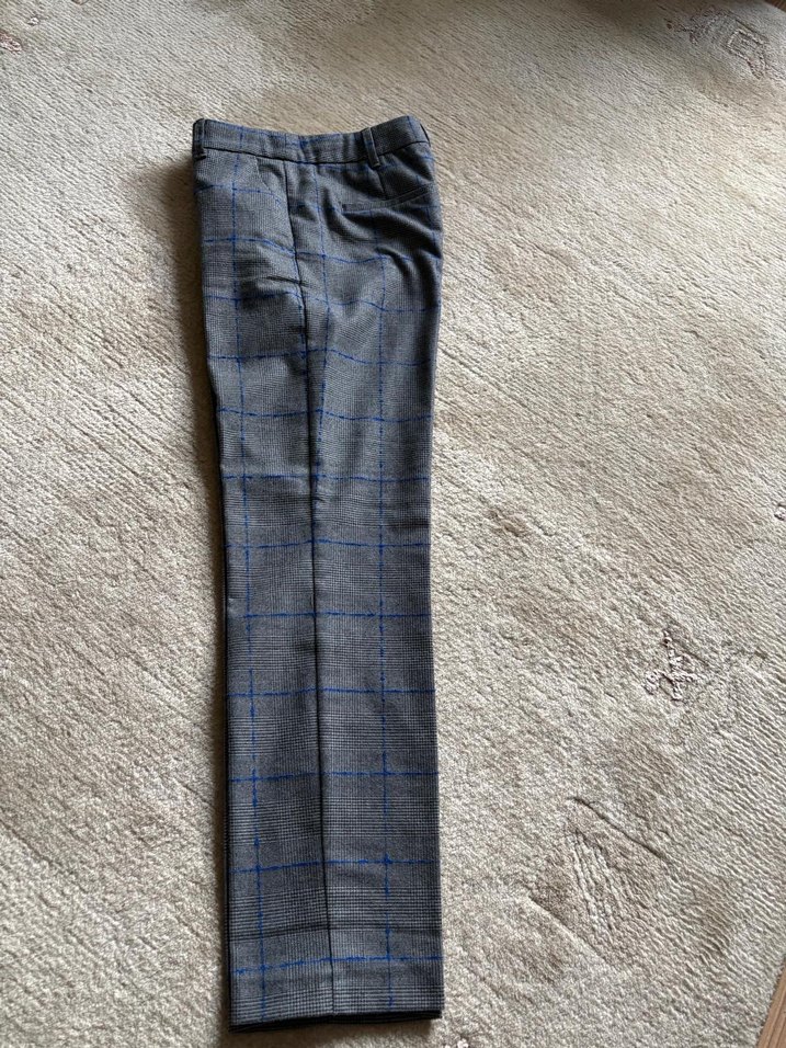 Gri ve mavi ekoseli havuç kesim çok kaliteli kumaşıyla ofis kullanımına uygun pantolon Max&Co marka sadece iki kez giyildi
