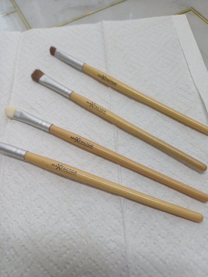 orjinal kutusunda Farklı fırça uçlarına sahip dört adet bej makyaj fırçası seti. Açık renk saplar doğal bir görünüm sunar. ️