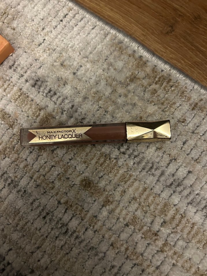 Max Factor Honey Lacquer parlak bej renkte, parlak bir bitiş sunan rujdur. Üzerinde 'HONEYLACOL' yazısı bulunmaktadır.