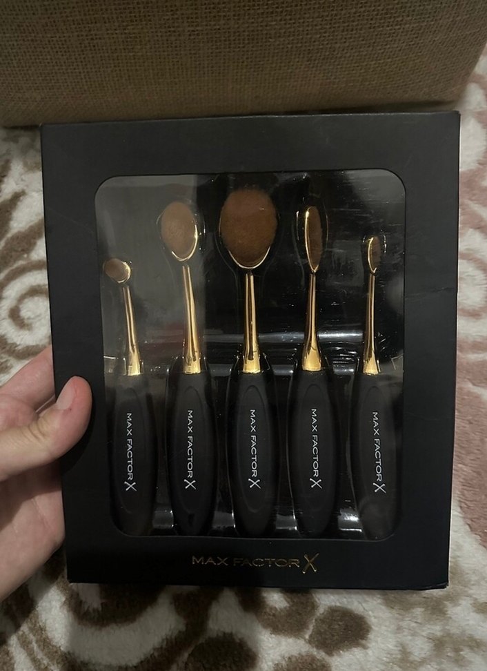 Max Factor X markalı, altın detaylı ve koyu renk saplı beşli makyaj fırça seti, hassas uygulama için tasarlanmıştır. ️