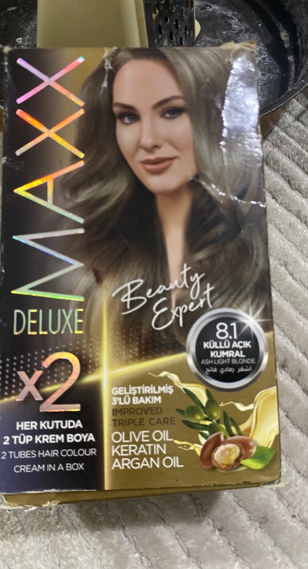 Maxar Deluxe 8.1 küllü açık kumral saç boyası, zeytinyağı, keratin ve argan yağı ile geliştirilmiş 3’lü bakım sunar. Her kutuda 2 tüp krem boya bulunur. Içdeki bir tüp boya kullanıldı tek boya içinde