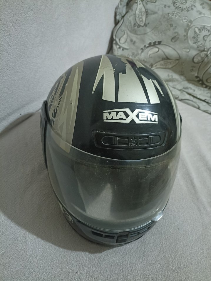 Maxem marka, baskılı siyah ve gri renkte, tokalı kayışlı ve şeffaf vizörlü plastik motosiklet kaskı. ️
