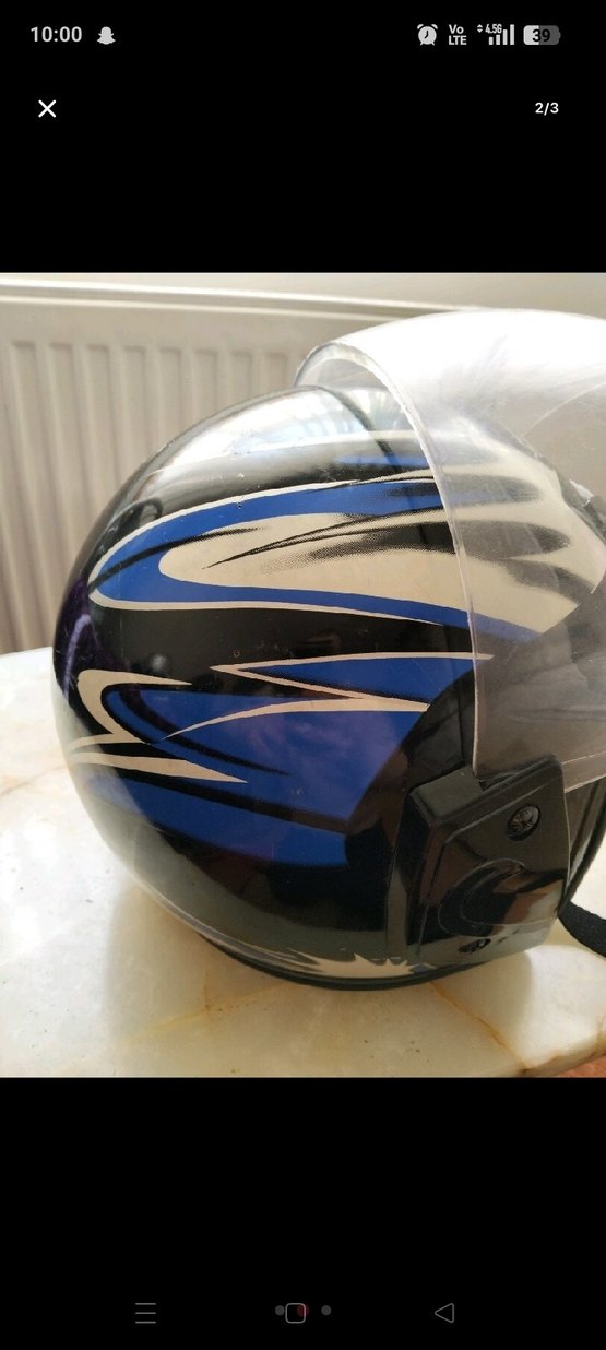 Koyu mavi baskılı tasarıma sahip, kemerli motosiklet kaskı.