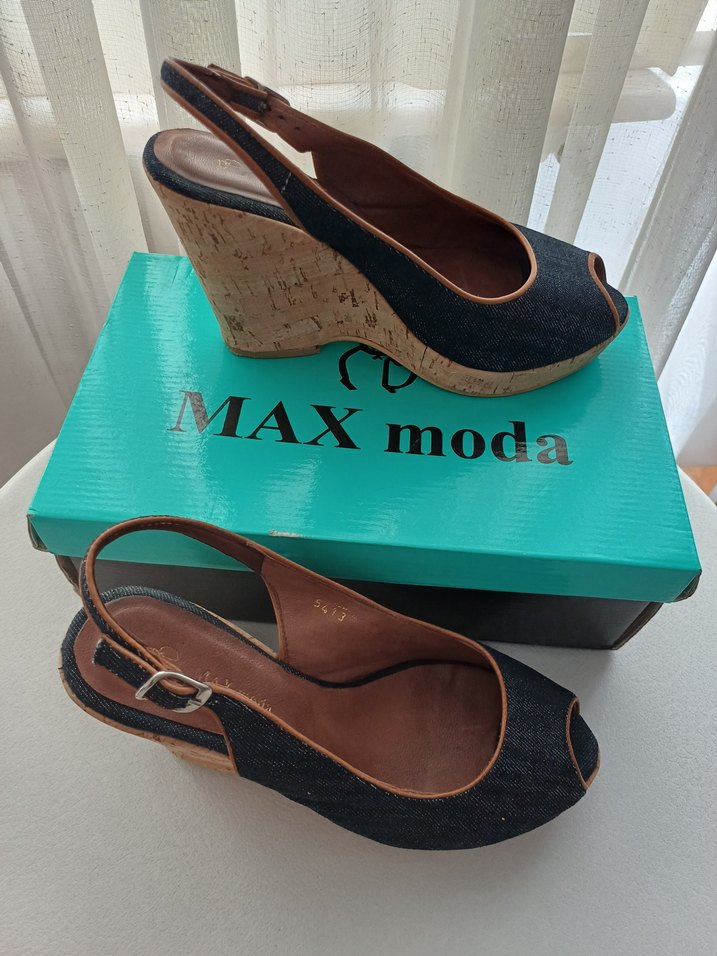 Çok cok az giyildi.Koyu kahverengi denim üst yüzeye, 39 numara mantar dolgu topuk ve tokalı kayışa sahip kadın dolgu topuklu ayakkabı. Topuk 10cm,platform 2cm.Günlük kullanıma uygun çağdaş tarz. MAX moda markası.