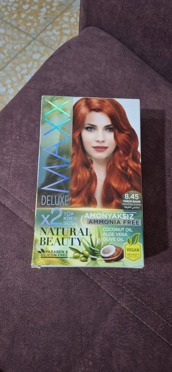 Maxx Deluxe 8.45 Tarçın Bakır saç boyası, amonyaksız formülüyle hindistancevizi yağı, aloe vera ve zeytinyağı içerir. Paraben ve silikon içermez, vegan dostudur.