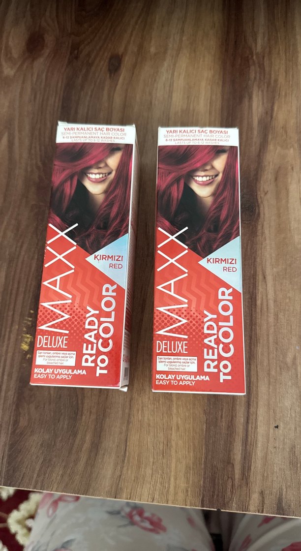 Maxx Deluxe kırmızı saç boyası, kolay uygulama ve yarı kalıcı renk sağlar. Hızlı renk değişimi için uygundur. 2 kutu olarak yollucam her kutuda 2 tüp var.