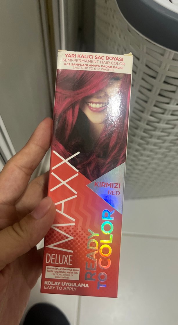 Maxx Deluxe kırmızı yarı kalıcı saç boyası, 6-12 şampuanlamaya kadar kalıcıdır ve kolay uygulanır. Saçlarınıza canlı kırmızı tonlar katar. 2 adet tüp boya mevcut bende de kutu 2 tane alırsanız 200 e bırakırım