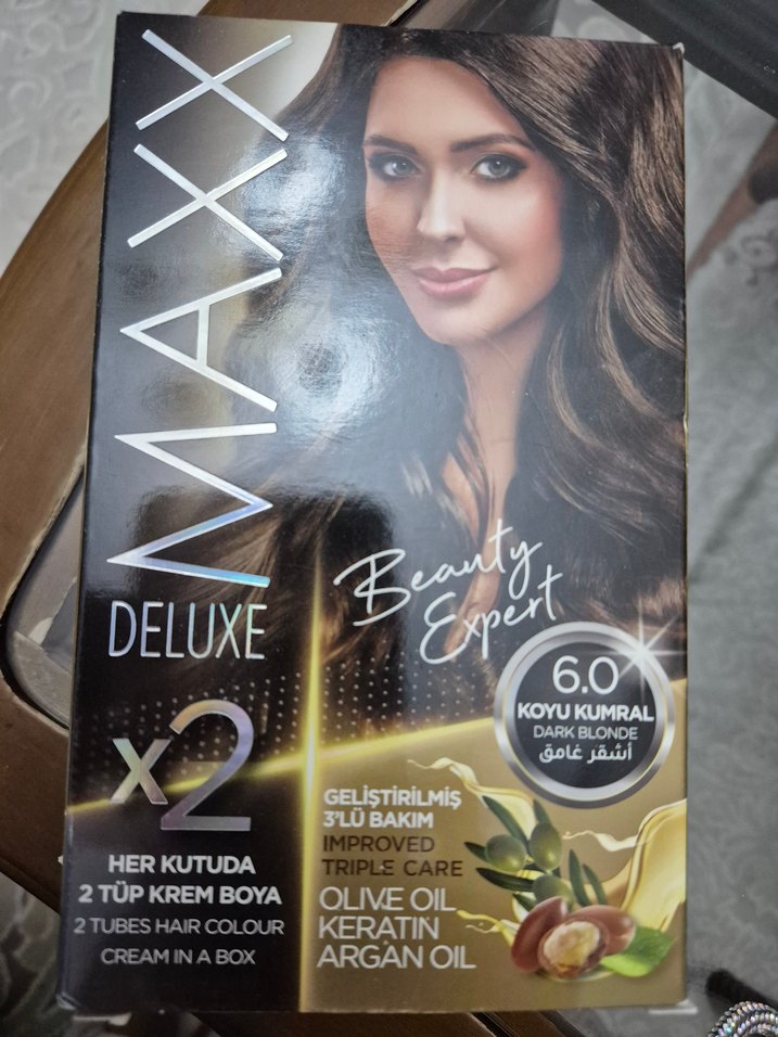Maxx Deluxe 6.0 koyu kumral saç boyası, zeytinyağı, keratin ve argan yağı ile geliştirilmiş 3'lü bakım sunar. Kutuda 2 tüp krem boya vardır. ♀️