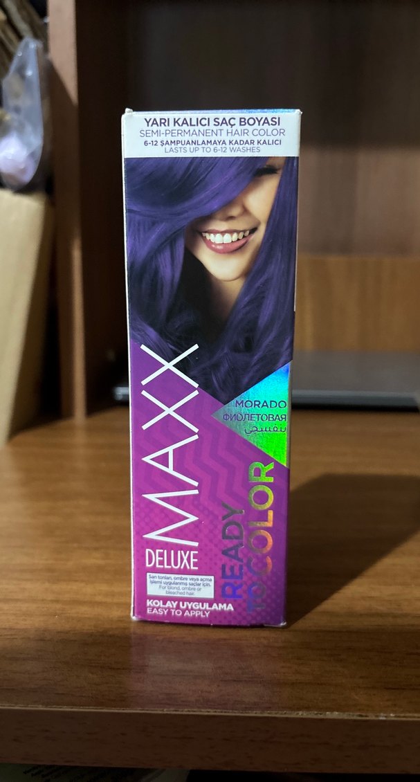 Maxx Deluxe mor yarı kalıcı saç boyası 6-12 yıkamaya kadar kalıcıdır. Kolay uygulanır ve saçta parlak renk sağlar. İçinde iki tane tüp eldiven ve kullanma kılavuzu var.