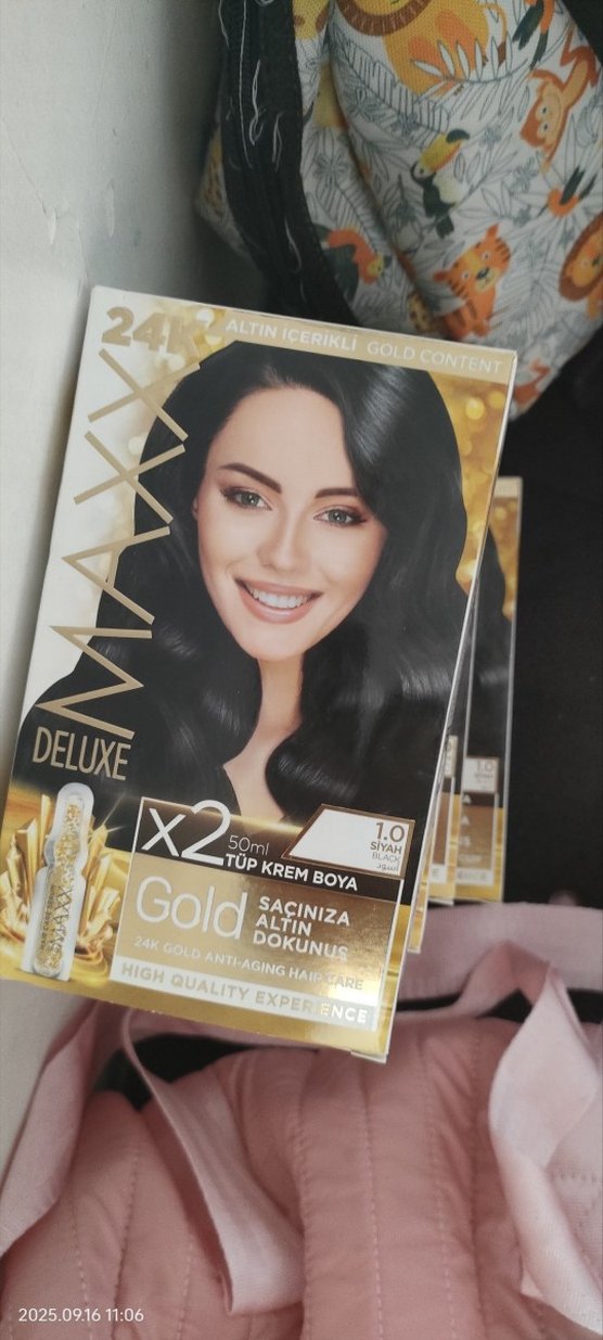 Maxxx Deluxe saç boyası, 24 ayar altın içeriğiyle zengin siyah renk ve yaşlanma karşıtı bakım sunar. İki adet 50ml krem tüpü ile yüksek kaliteli uygulama sağlar. ✨