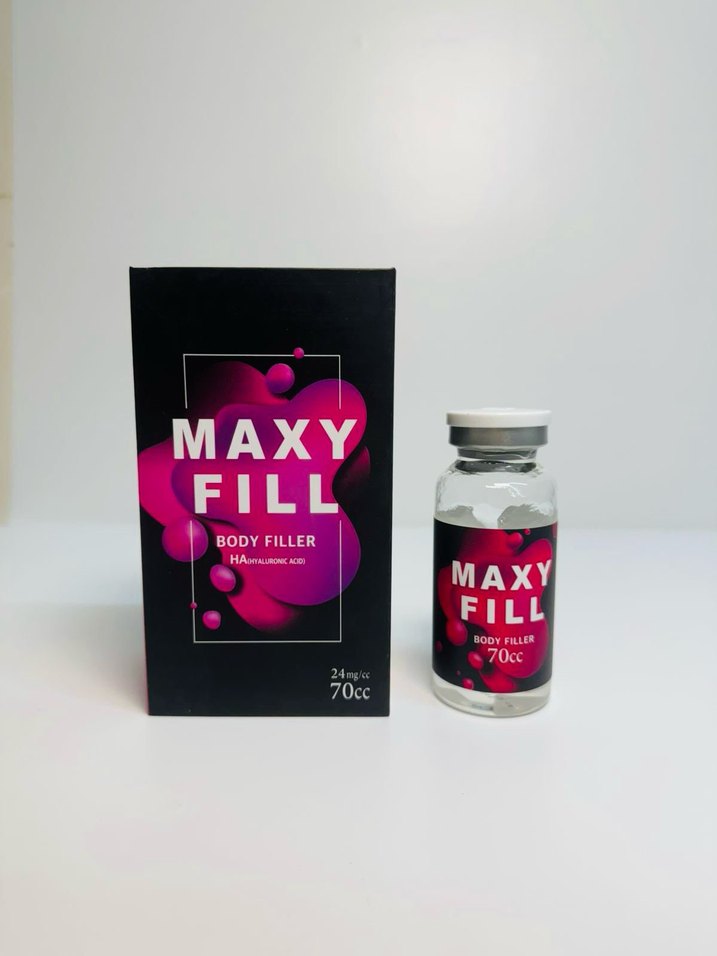 Hiyalüronik asit içeren Maxy Fill vücut dolgu serumu, 70cc şişede cildi canlandırmaya ve dolgunlaştırmaya yardımcı olur.
