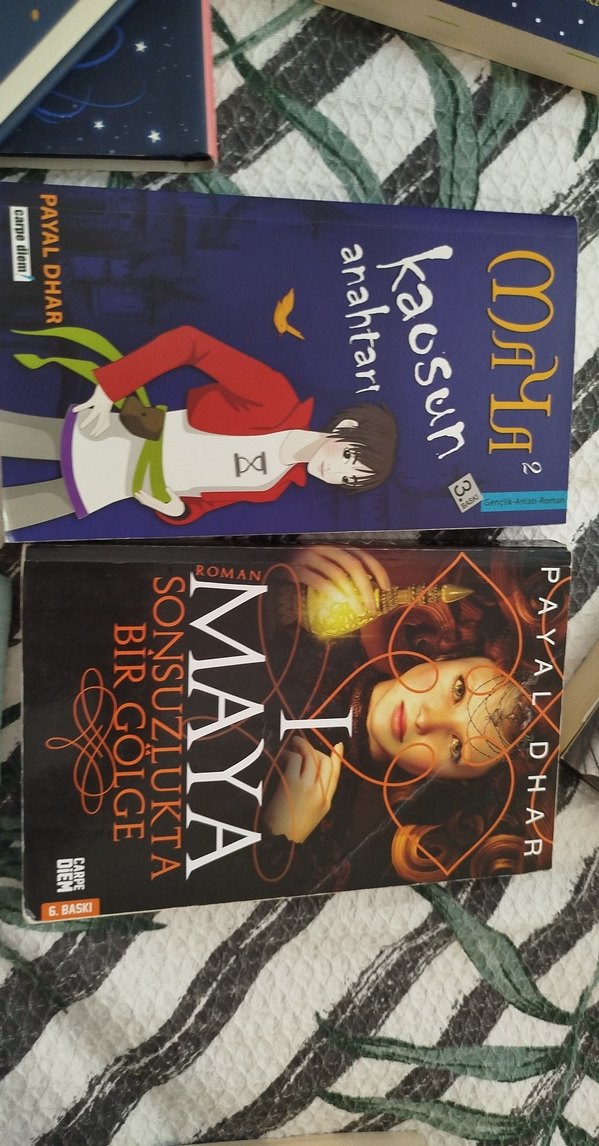 Payal Dhar'ın iki romanı: "Maya 2 Kaosun Anahtarı" ve "Maya Sonsuzlukta Bir Gölge". Türkçe baskılar, dikkat çekici kapaklı.