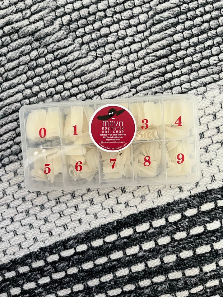 MAYA beyaz tırnak süslemeleri seti, 0'dan 9'a numaralandırılmış farklı boyutlarda, şeffaf kutuda sunuluyor.