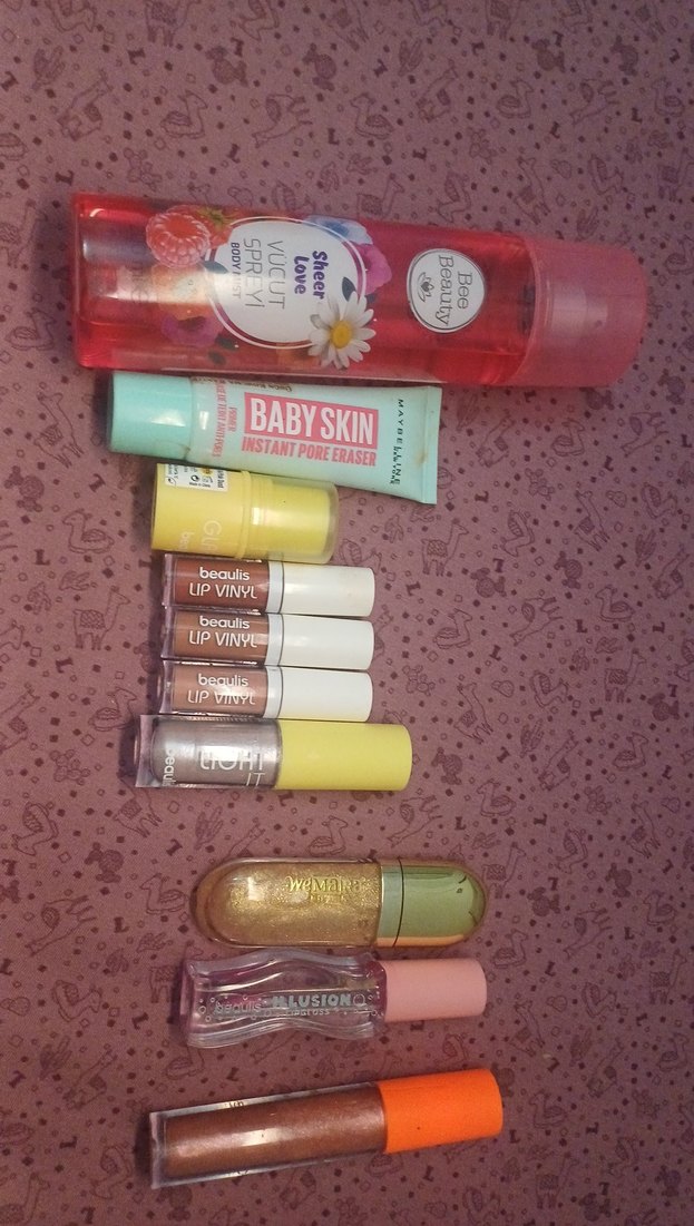 BU İLANI SATIN ALMAYIN•sheer love body mist •maybelline baby skin primer •beaulis stick higlighter(aydınlatıcı) •beaulis lip vinyl set •beaulis light it •beaulis illusion lipgloss •we mara lip gloss •diomond shine lip gloss*kapaginda çatlak var. İstediğiniz ürün veya ürünler için ilan açabilirim. Light it diomond shine dışındakileri 1-2 kere kullandim sadece.