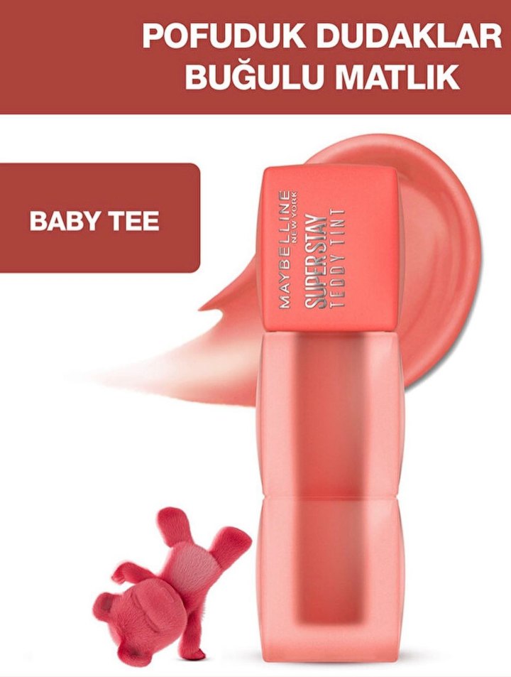 Maybelline Baby Tee mat ruj, pastel pembe tonunda, dudaklara yumuşak ve buğulu mat bir görünüm sağlar.