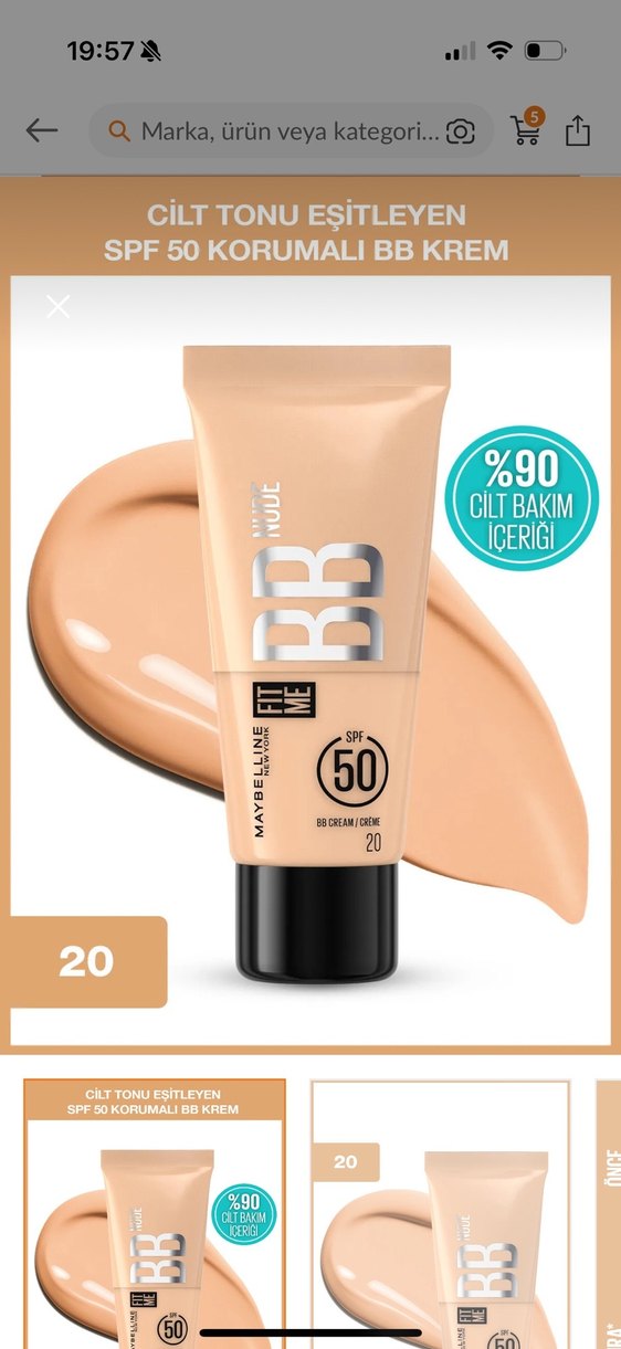 Maybelline BB krem SPF 50 koruma sağlar, %90 cilt bakım içeriğine sahiptir ve cilt tonunu eşitler. Açık bej renkte, hafif kapatıcılı.