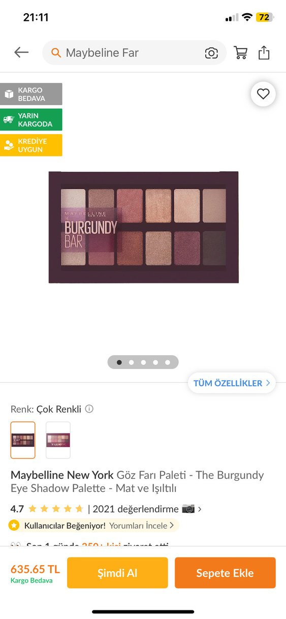 Maybelline Burgundy Bar Göz Farı Paleti, mat ve ışıltılı çok renkli tonlar sunar. Canlı bordo renkleriyle farklı makyajlar için uygundur. SADECE 1 kez kullanıldı cok farım var satıyorum