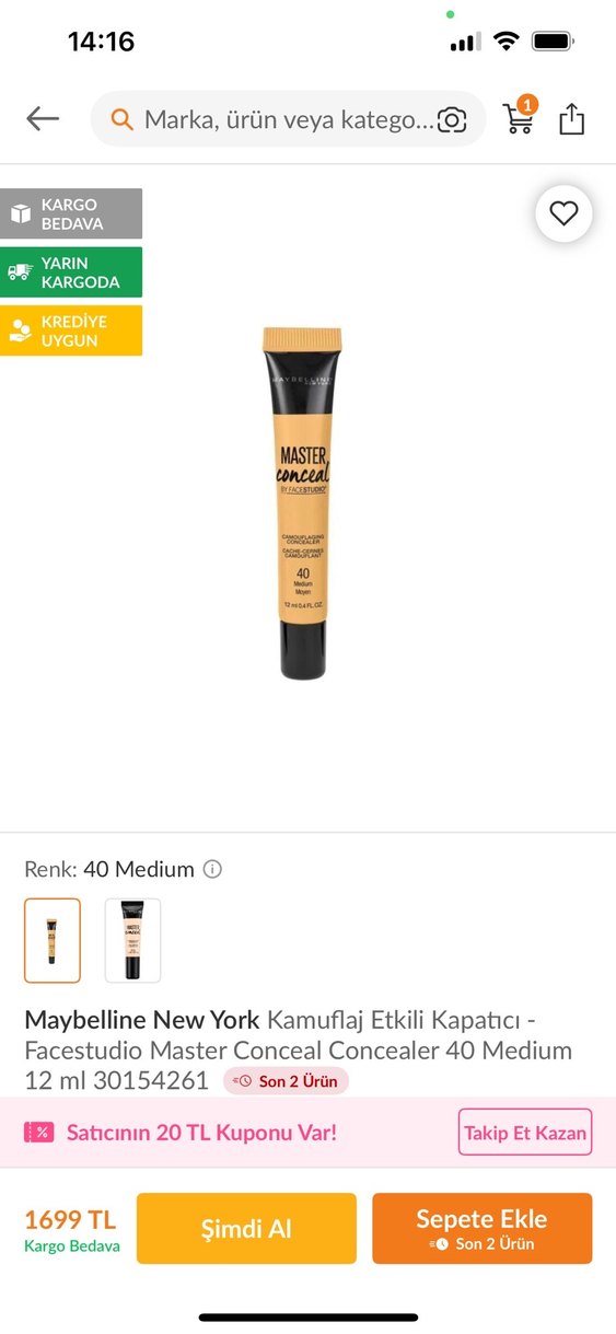 Maybelline Facestudio Master Conceal 40 Medium kapatıcı, 12 ml tüpte etkili kamuflaj sağlar. Pürüzsüz ve kolay karışan yapıya sahiptir. ✨