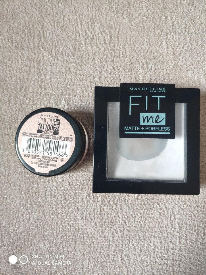 Maybelline Fit Me Matte + Poreless bej pudra ve gri Color Tattoo far bir arada. Uzun süre kalıcı ve mat görünüm sağlar.