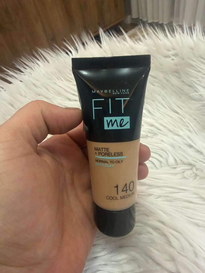 Maybelline Fit Me Matte + Poreless fondöten, 140 Cool Medium tonunda, normalden yağlıya ciltler için kil içeren mat ve pürüzsüz bitiş sağlar.