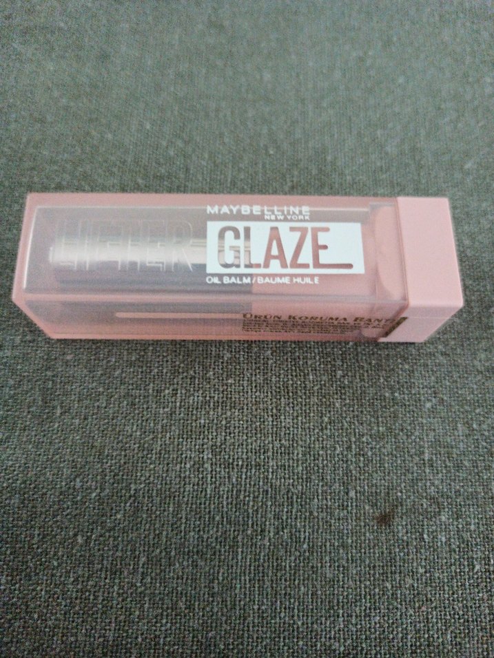 Maybelline Glaze yağlı dudak balmı, bej renkli ve hafif gri tonlu, dudakları nemlendirir ve yumuşak bir görünüm sağlar.