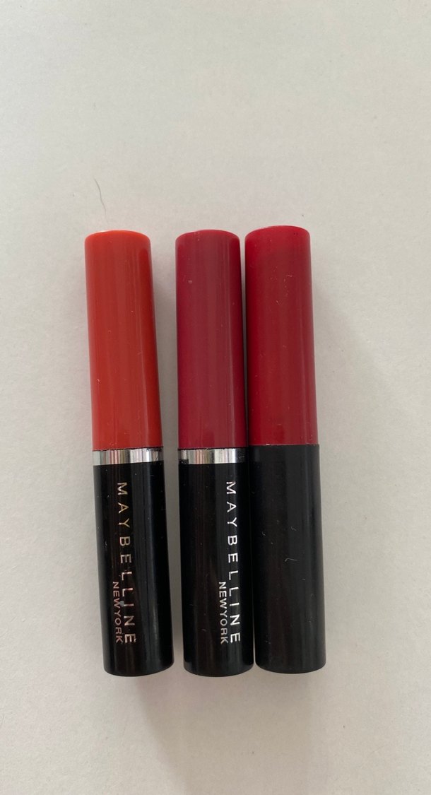 Maybelline New York markalı, farklı koyu kırmızı tonlarında üç adet ruj seti. Siyah ve kırmızı şık ambalajda.