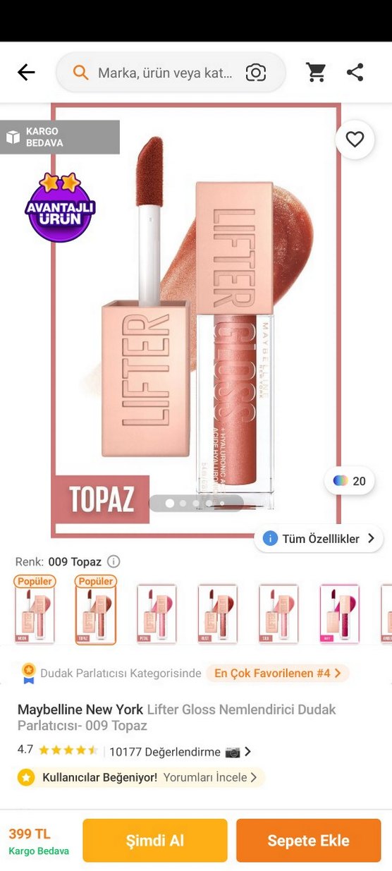 Maybelline Lifter Gloss, pastel bej Topaz renginde, dudaklara parlak ve nemlendirici bir görünüm sağlar. Popüler ve pürüzsüz dokulu bir ürün. kullanmadığım için satıyorum glossum çok